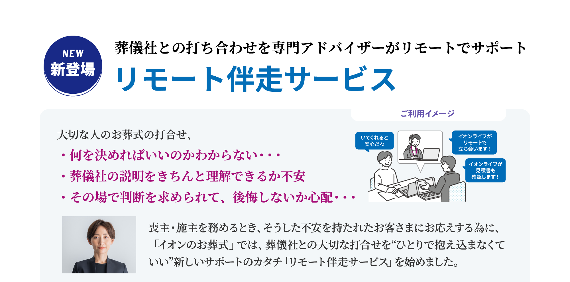 「イオンのお葬式」は、葬儀・お葬式に関わるお客さまの不安や心配をなくし、